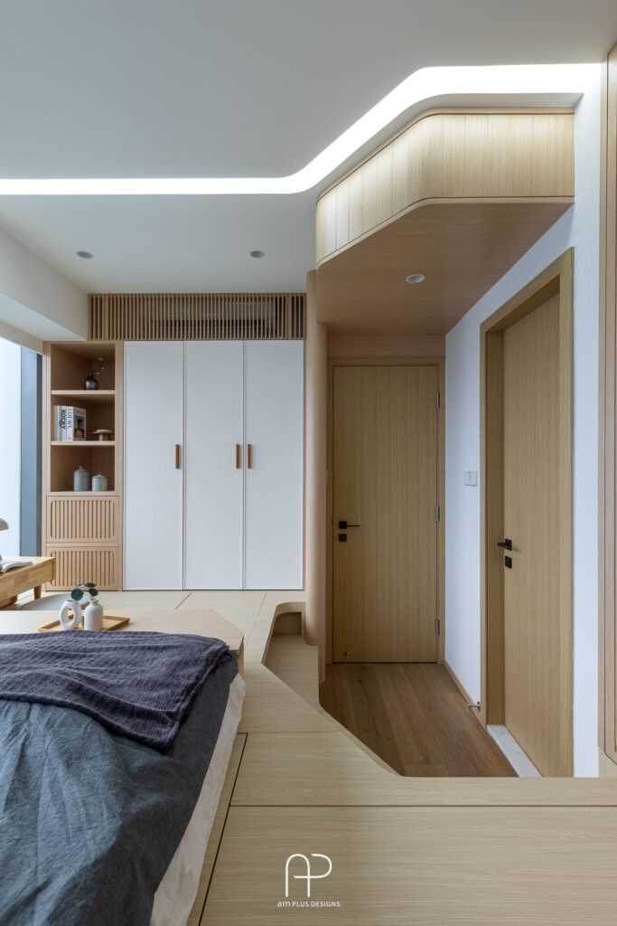 空間不僅加入木色半圓柱、木天花設計,包含燈槽、地台、地櫃、木天花,也都保有弧邊造型,與客廳款式相襯。