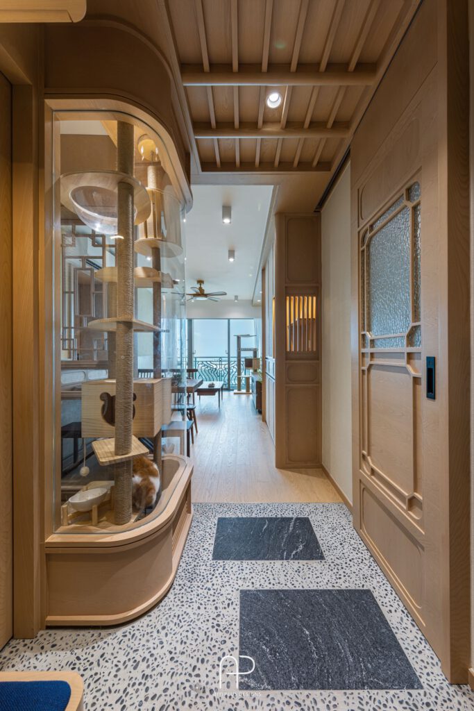 設計首先從玄關處的仿原木橫樑、碎石地面定調整體氛圍。特別規劃的玻璃隔間不只讓視覺更為通透,也能方便屋主能隨時與毛孩互動;巧妙的圓弧邊角也帶出和諧、趣味效果。